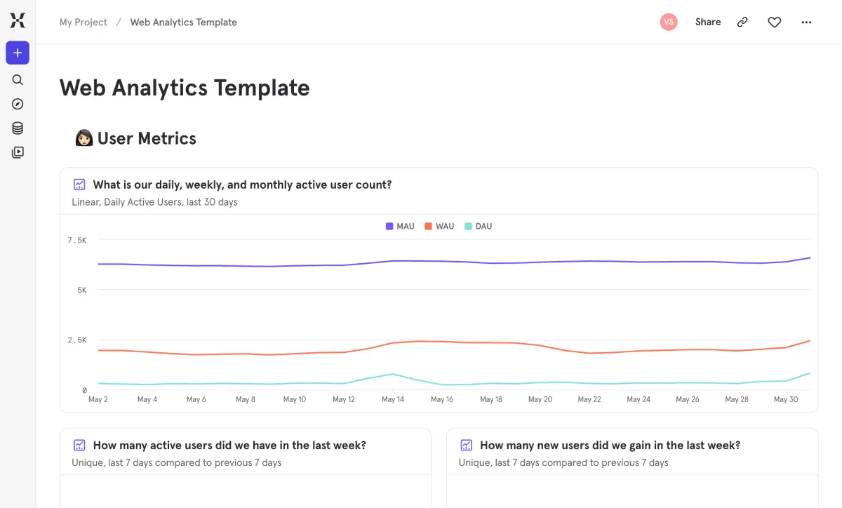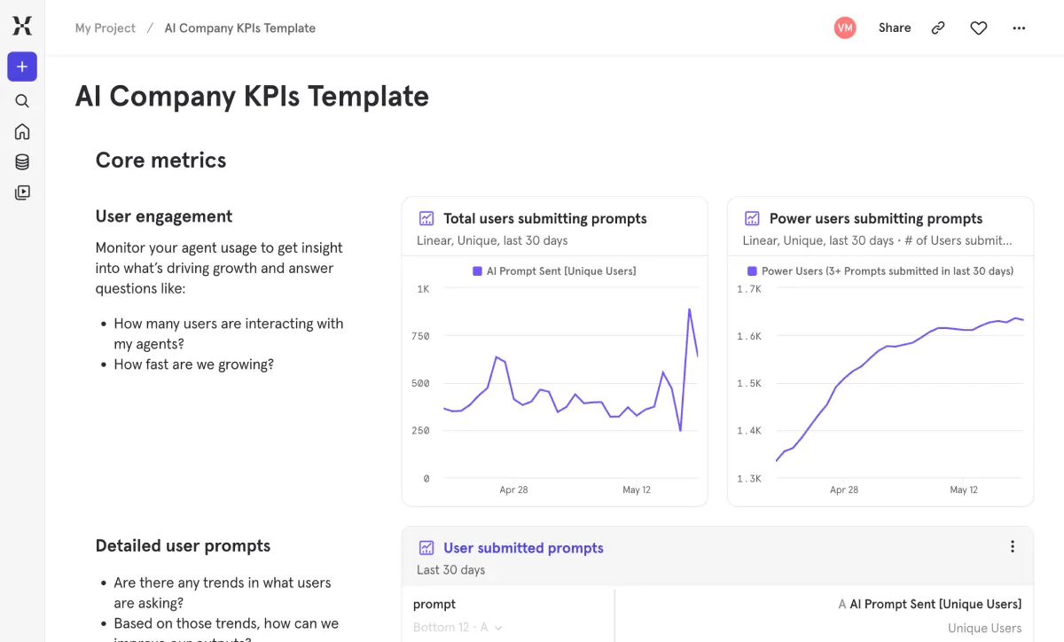Foundational views to monitor product health, user retention, and core growth metrics at a glance.